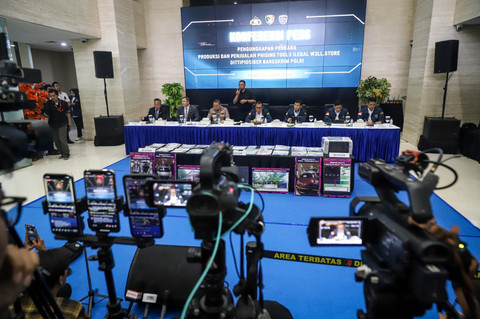 Direktorat Tindak Pidana Siber Bareskrim Polri menggelar konferensi pers terkait pengungkapan kasus produksi dan penjualan perangkat lunak ilegal di Gedung Awaloedin Djamin, Jakarta, Rabu (22/4/2026).