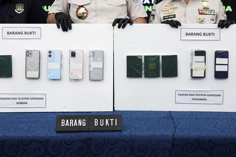 Barang bukti saat ungkap kasus dugaan Tindak Pidana Penyelundupan Manusia (TPPM) di Jakarta, Senin (20/4/2026). Foto: Ajeng Dinar Ulfiana/REUTERS