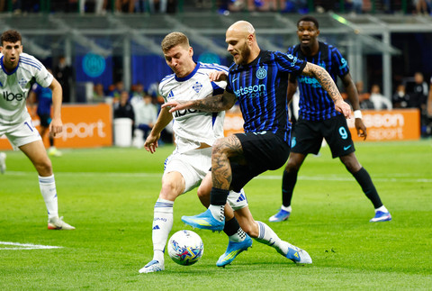 Petar Sucic dari Inter Milan beraksi dengan Nico Paz dari Como pada pertandingan Copa Italia antara Inter Milan vs Como di San Siro, Milan, Italia, Rabu (22/4/2026) dini hari WIB. Foto: Alessandro Garofalo/REUTERS