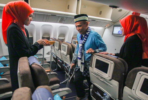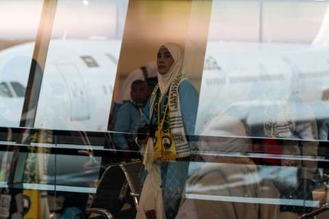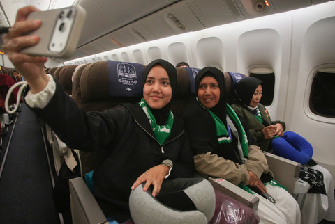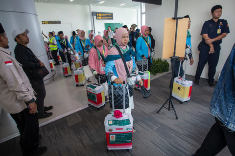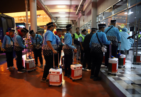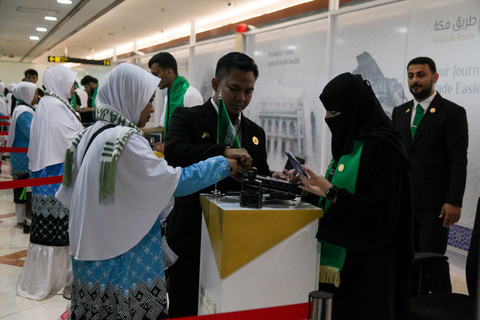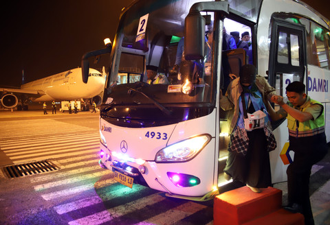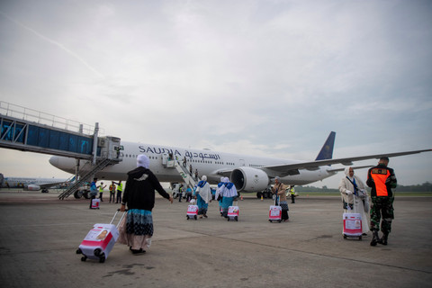 Jemaah haji kloter pertama mendarat di Madinah, Arab Saudi, sebelum melakukan rangkaian puncak haji di Makkah.