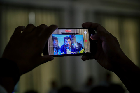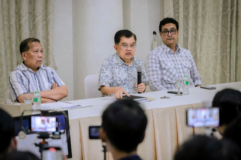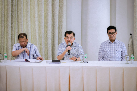 Wakil Presiden ke-10 dan ke-12 RI, Jusuf Kalla, didampingi mantan Menteri Hukum dan HAM, Hamid Awaluddin, serta mantan Juru Bicara Wakil Presiden periode 2014-2019, Husain Abdullah, menyampaikan keterangan pers di kediamannya di Jakarta Selatan, Sabtu (18/4/2026).