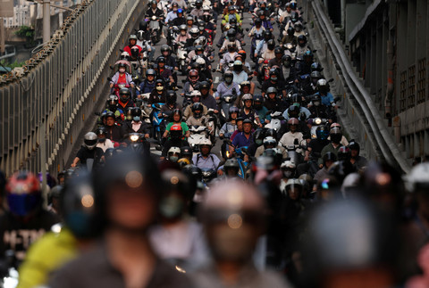 Para pengendara motor menggunakan jalur keluar dari Jembatan Taipei selama jam sibuk pagi hari di Taipei, Taiwan, Selasa (21/4/2026). Foto: Edgar Su/REUTERSJembatan utama sepanjang 482,6 meter ini populer disebut sebagai "Scooter Waterfall" atau sebagai Air Terjun Skuter karena menjadi ikon kepadatan lalu lintas sepeda motor di saat jam sibuk. Foto: Edgar Su/REUTERSJembatan ini menghubungkan Distrik Datong, Taipei dengan Distrik Sanchong di New Taipei City yang melintasi Sungai Tamsui. Foto: Edgar Su/REUTERSFoto: Edgar Su/REUTERSFoto: Edgar Su/REUTERS