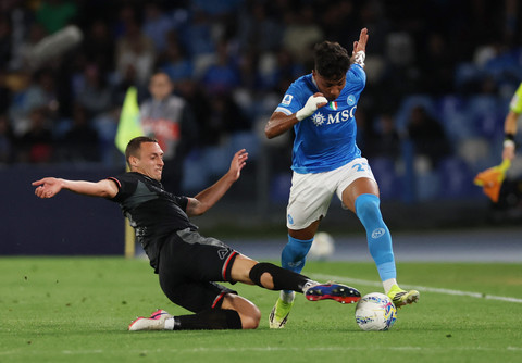 Filippo Terracciano dari Cremonese beraksi bersama Alisson Santos dari Napoli pada pertandingan Liga Italia antara Napoli vs Cremonese di Stadio Diego Armando Maradona, Naples, Italia, Sabtu (25/4/2026) dini hari WIB. Foto: Ciro De Luca/REUTERS