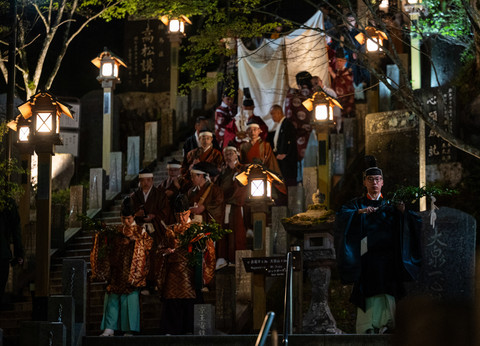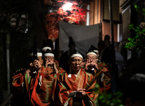 Dengan mengenakan jubah tradisional, para pendeta berjalan perlahan menuju kuil suci di puncak gunung saat menggelar festival Hinode Sai atau festival Matahari Terbit yang telah berlangsung selama dua hari di Ome, Tokyo, Jepang, pada Rabu (29/4/2026).