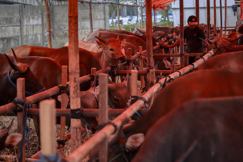 Sejumlah sapi berjejer di kandang semi permanen di Jalan Gatot Subroto, Jakarta, Kamis (23/4/2026). Foto: Jamal Ramadhan/kumparan