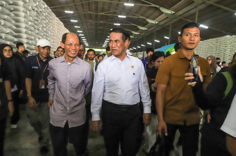 Menteri Pertanian RI Amran Sulaiman didampingi Kepala Bulog Ahmad Rizal Ramdhani melakukan sidak pengecekan stok beras di Gudang Beras Bulog, Karawang, Jawa Barat, Kamis (23/4/2026). Foto: Iqbal Firdaus/kumparan