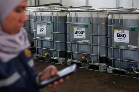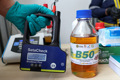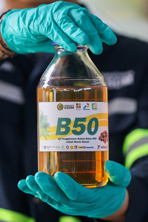 Seorang teknisi laboratorium menunjukkan hasil pengujian biodiesel dengan campuran 50 persen di kawasan Lembang, Selasa (21/4/2026). Kegiatan ini menjadi bagian dari rangkaian persiapan menuju penerapan bahan bakar B50 secara nasional berbasis minyak sawit. Foto: Ajeng Dinar Ulfiana/REUTERSPemerintah Indonesia tengah mendorong peningkatan mandatori biodiesel dari B40 menjadi B50 sebagai langkah memperkuat ketahanan energi sekaligus menekan ketergantungan terhadap impor bahan bakar fosil. Kebijakan ini juga diharapkan mampu mengoptimalkan pemanfaatan sumber daya dalam negeri. Foto: Ajeng Dinar Ulfiana/REUTERSDirektur Jenderal Energi Baru, Terbarukan, dan Konservasi Energi (EBTKE) Kementerian ESDM, Eniya Listiani Dewi, menyebut hasil sementara pengujian pada mesin diesel menunjukkan performa yang stabil tanpa gangguan teknis berarti. Foto: Ajeng Dinar Ulfiana/REUTERSPengujian yang dilakukan secara menyeluruh, mulai dari kualitas bahan bakar hingga ketahanan operasional, bahkan telah mencapai lebih dari 900 jam tanpa kendala, menjadi indikasi kuat kesiapan implementasi B50 di berbagai sektor industri. Foto: Ajeng Dinar Ulfiana/REUTERSFoto: Ajeng Dinar Ulfiana/REUTERSFoto: Ajeng Dinar Ulfiana/REUTERSFoto: Ajeng Dinar Ulfiana/REUTERSFoto: Ajeng Dinar Ulfiana/REUTERS